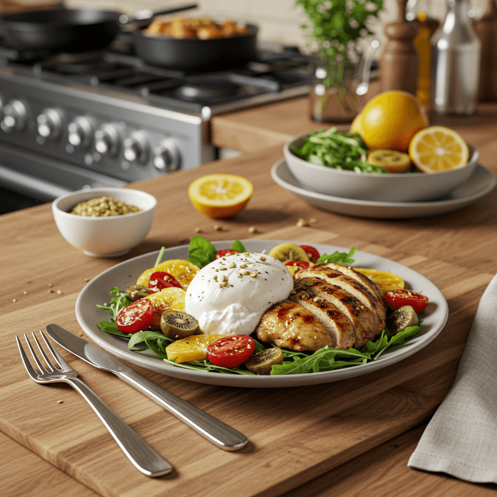 Grilled Chicken and Burrata Arugula Salad with Seasonal Fruits