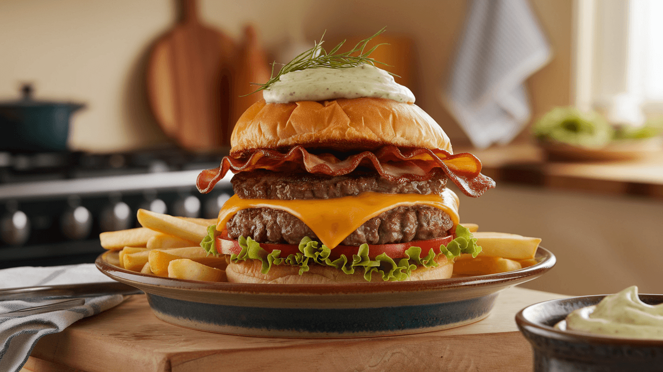 Ultimate Five-Cheese Bacon Beef Burgers with Dill Pickle Aioli